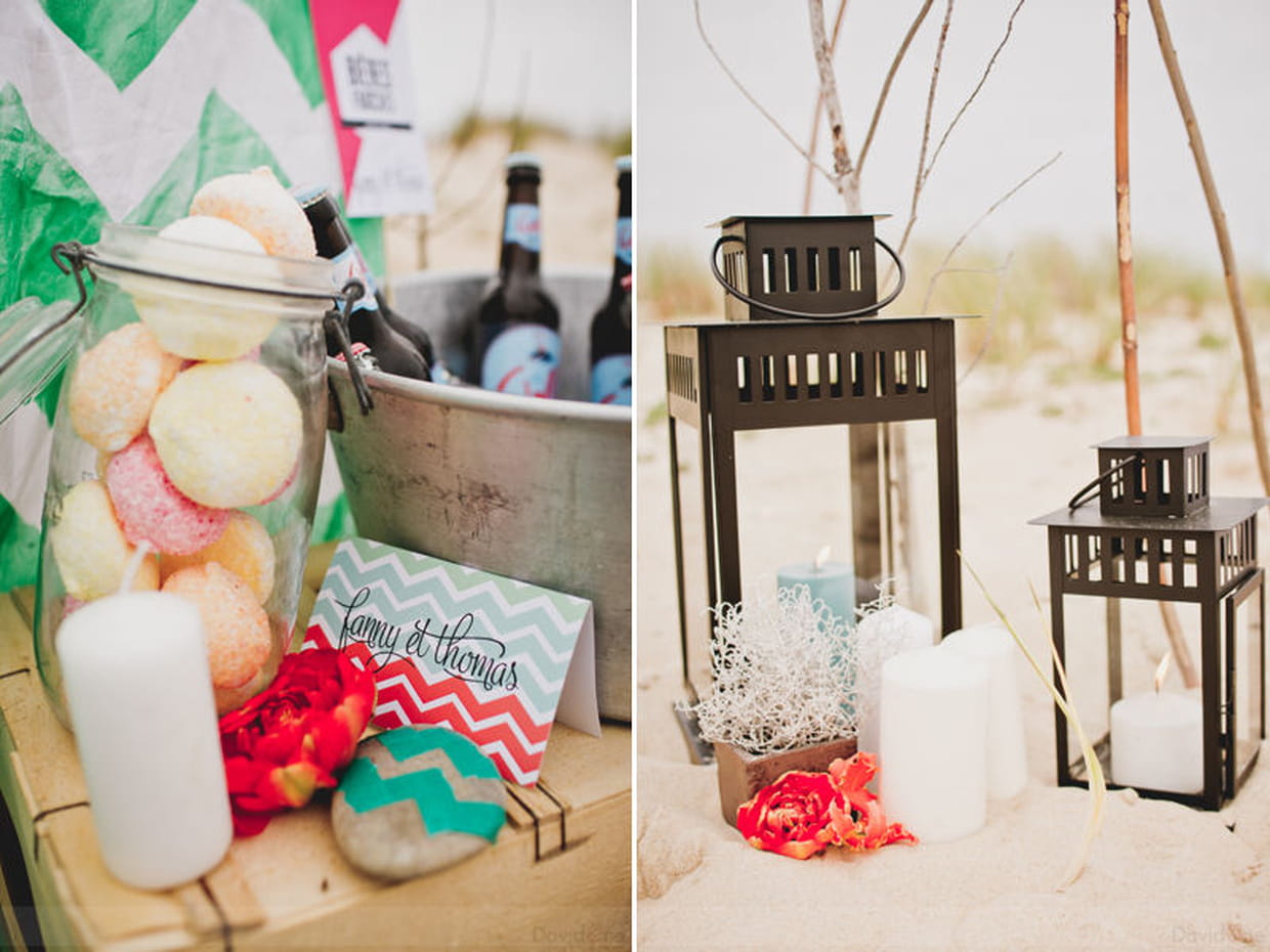 Photophores, grandes lanternes posées dans le sable, galets ou caissettes en bois... les éléments sont naturels et invitent à la détente.