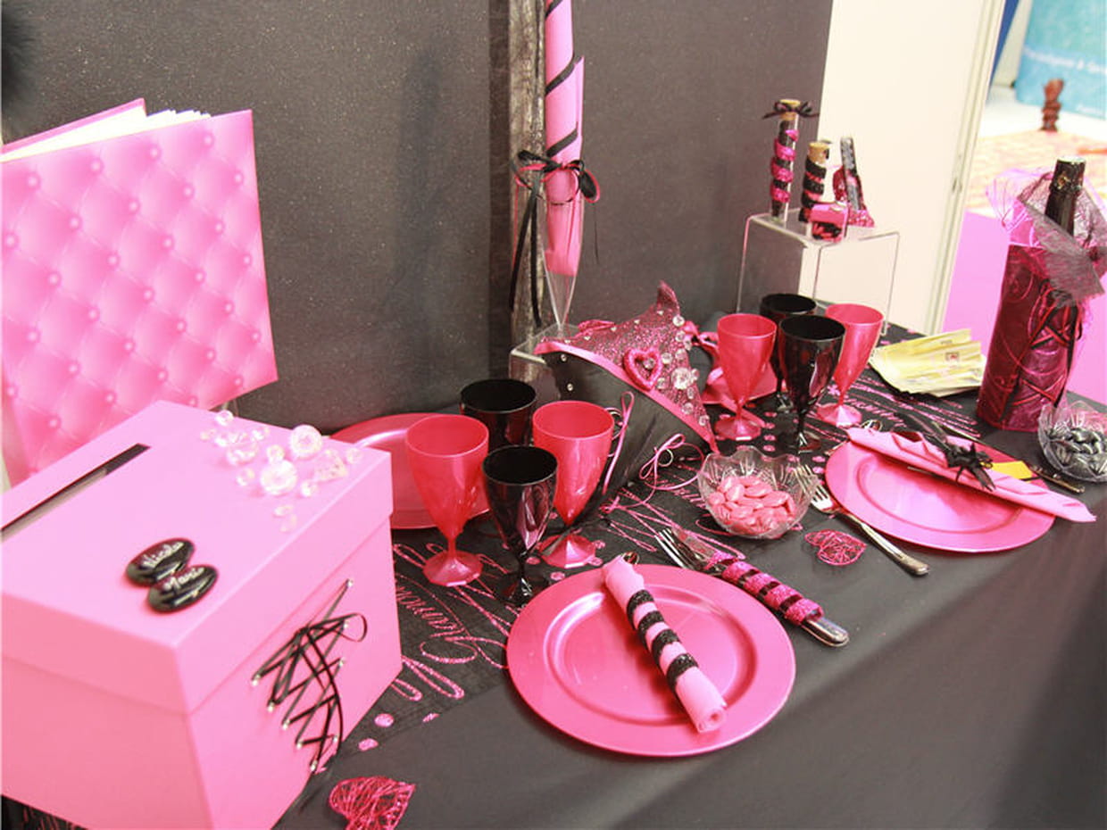 Bécus boutique propose la vente d'éléments de décoration pour votre mariage. Ici, la boutique a réalisé une table résolument glamour, d'inspiration un brin cabaret. Rose flashy et noir sont les couleurs de rigueur pour ce thème.