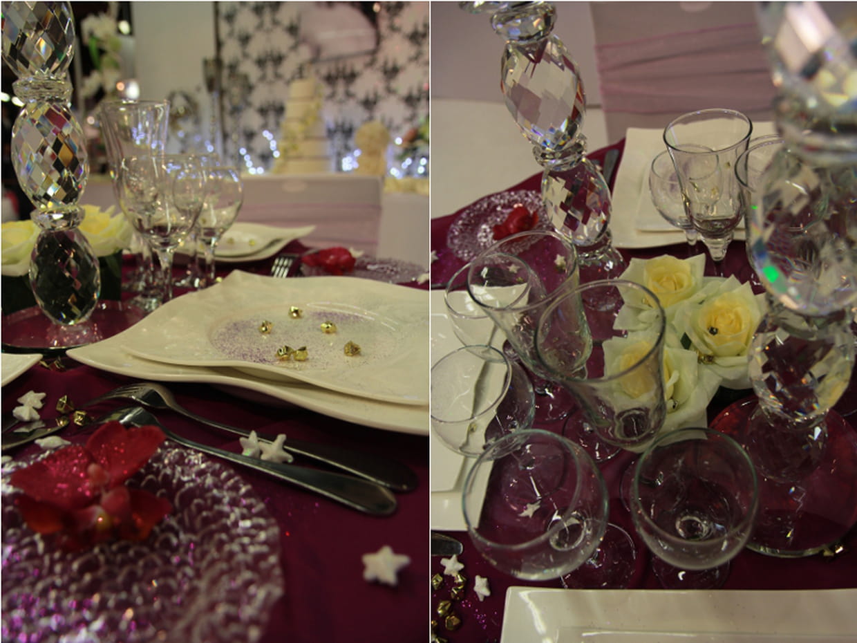 Sur la table créée par l'organisateur d'événements, c'est un peu Noël : un nappage dans les tons lie de vin, des assiettes mouchetées de paillettes parme et de perles dorées, un centre de table fleuri et un majestueux bougeoir de verre. Des étoiles blanches et des fleurs d'orchidée rouge pailletées sont disposées dans de petites soucoupes en verre.