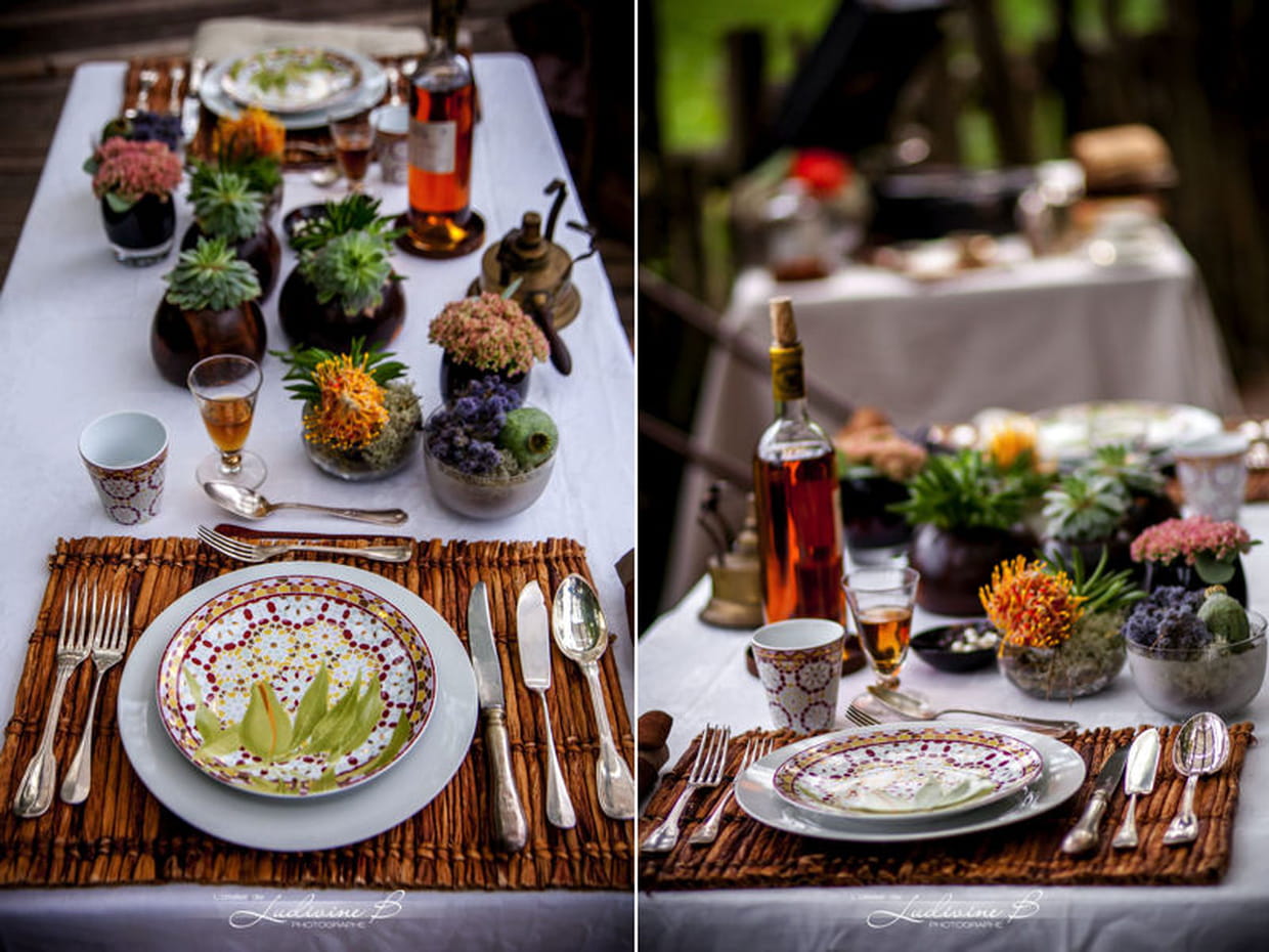 Pour la décoration de la tablée, porcelaine fine et couverts en argent reposent sur un set de table rustique. Des mini-pots de compositions florales égayent le tout.