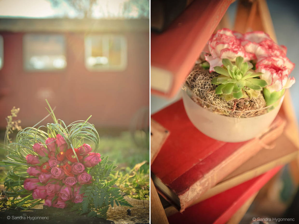 Le bouquet est composé de roses fuchsia et s'épanouit dans les lumières rasantes de la saison.