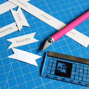 Imprimer sur un papier gris clair la liste des prénoms de vos invités. Télécharger le gabarit du fanion et s'en servir pour découper chaque prénom. Commencer par couper des bandes de 1, 5cm avec le prénom centré dans la hauteur à l'aide du cutter en prenant appui sur le tapis de découpe pour les repères. Placer ensuite le fanion en centrant le prénom et marquer les repères des angles au crayon de papier. Couper au cutter pour former les fanions.