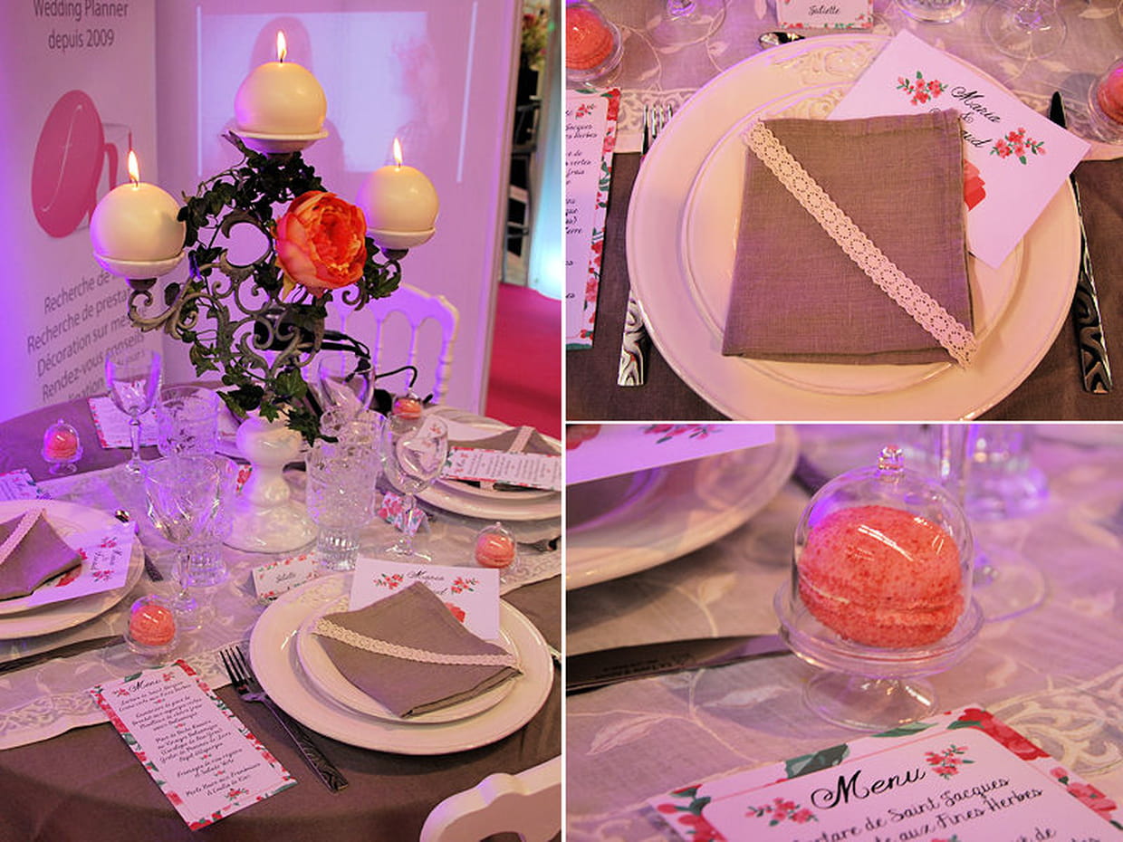 Des menus aux impressions florales, des serviettes en lin, des petits macarons sous cloche... c'est une ambiance intime et un brin rétro que nous propose l'agence de wedding-planner Floasis Events. Site web : www.floasis.fr