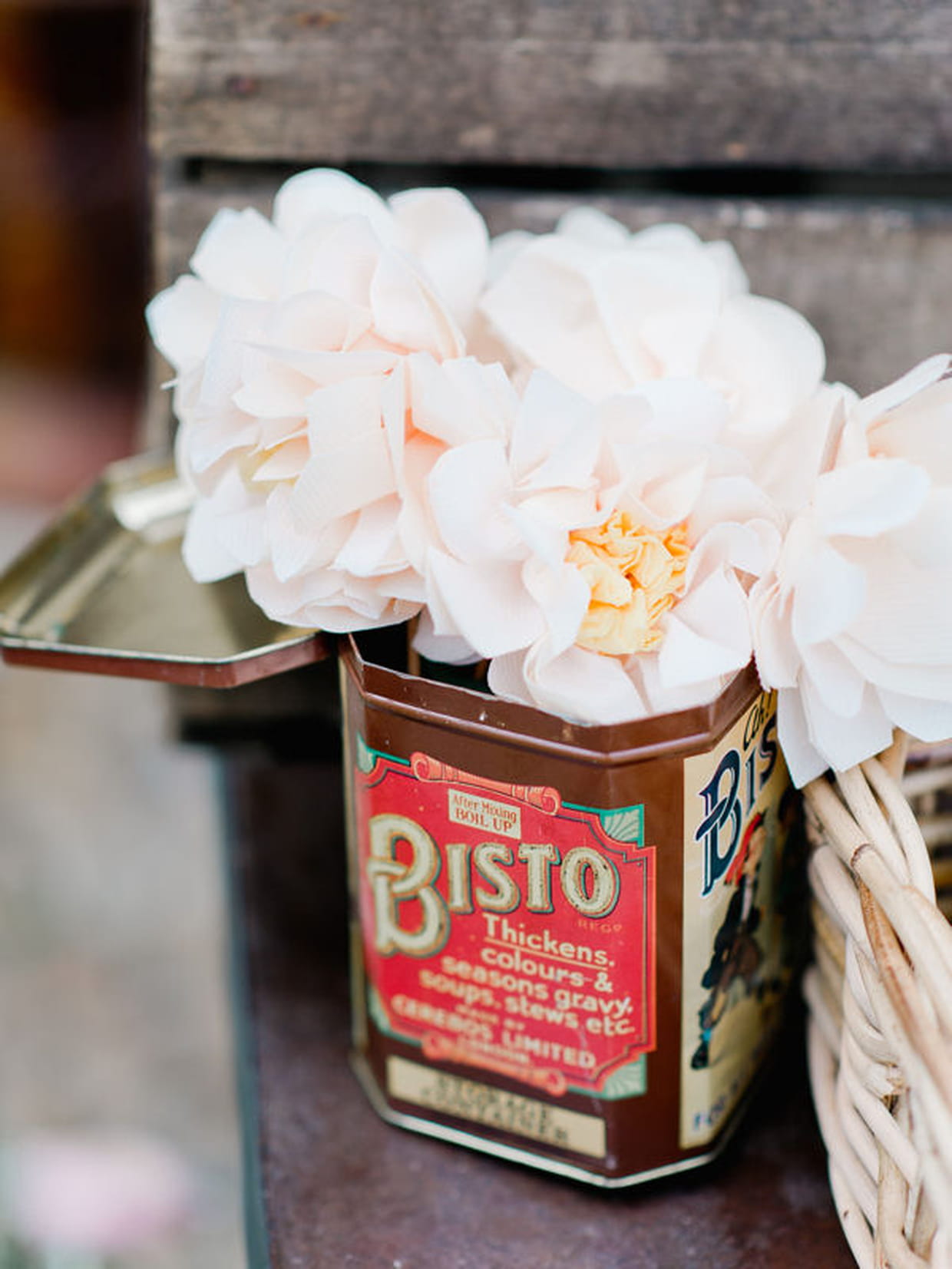 Pour une union champêtre, l'agence Les Cocottes a fait "beaucoup de "récup" pour ce mariage afin de lui donner une petite touche rétro". Par exemple, cette boite métallique sert de vase.