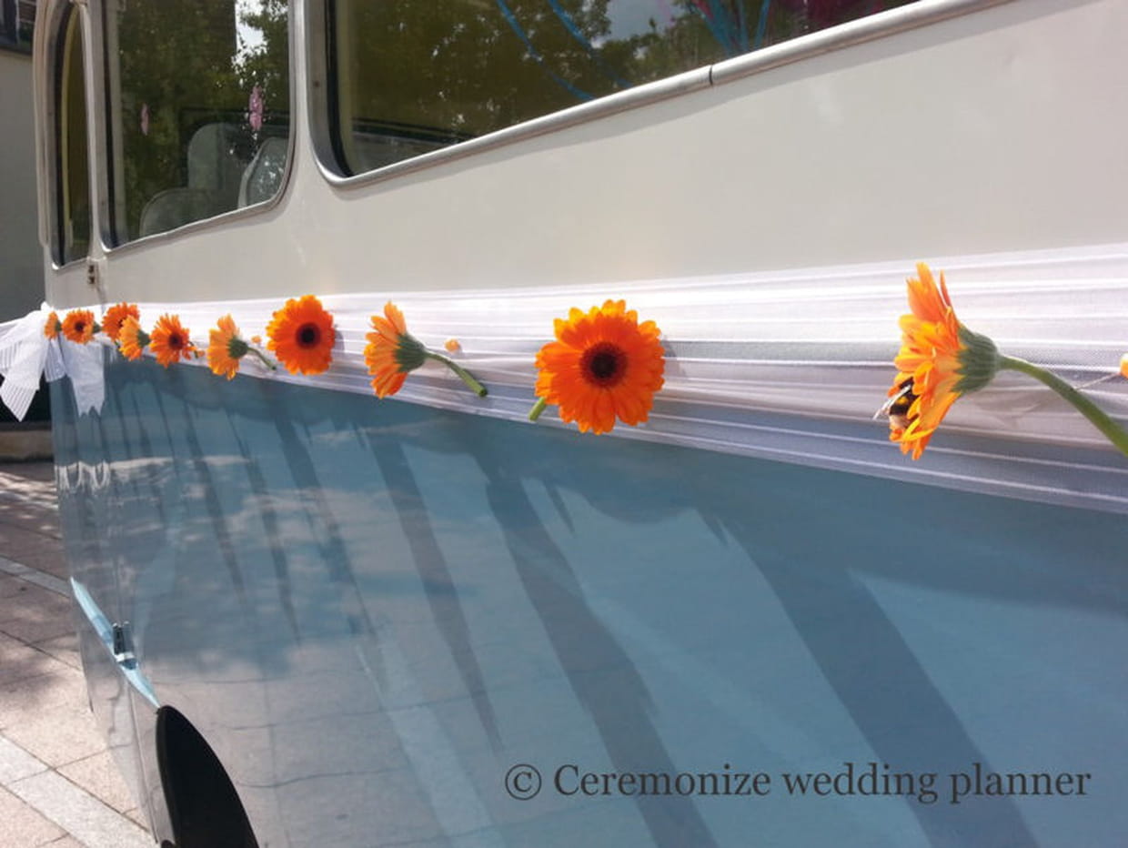 "Voici une petite astuce pour une jolie décoration de voiture qui change de la grosse composition de capot : agrémenter le tulle avec quelques petites fleurs, choisies en adéquation avec le thème, qui seront piquées avec de jolies épingles" propose Virginie Mention, de l'agence Ceremonize.