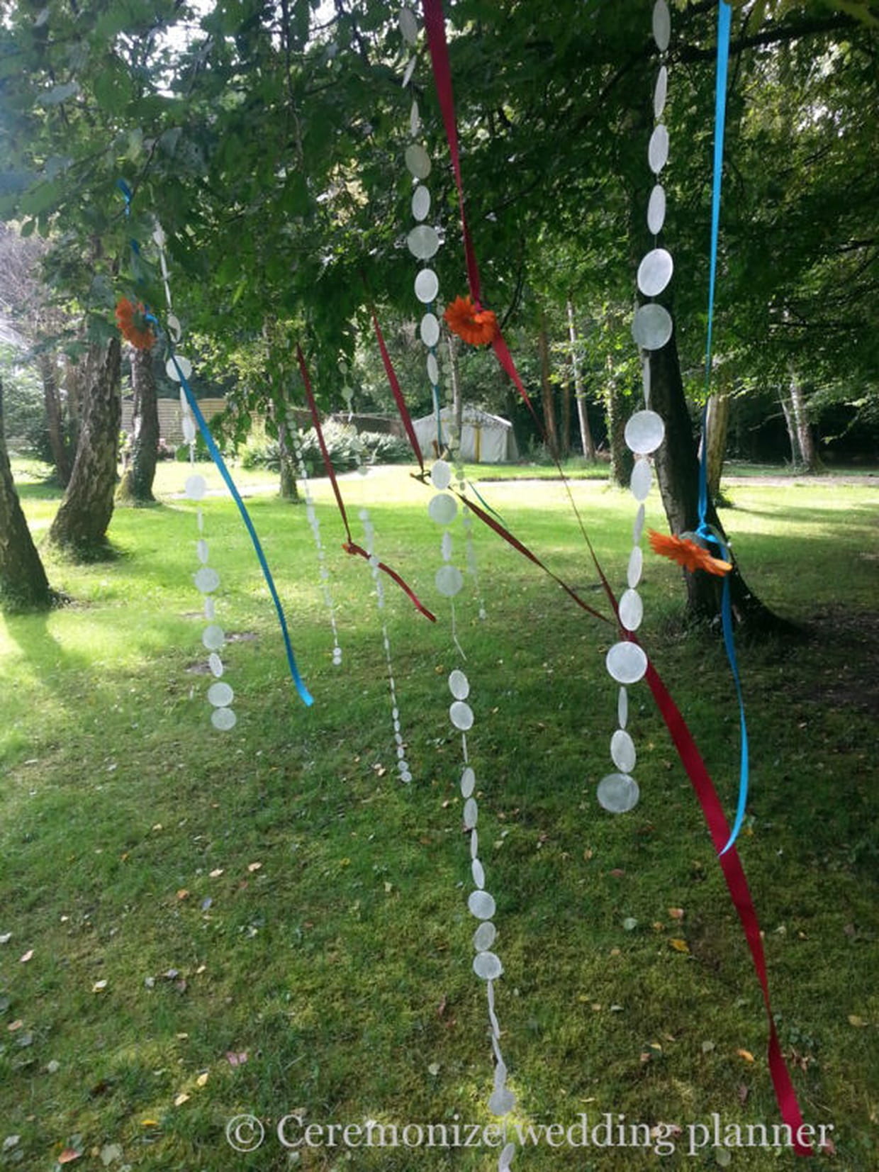 Ces mariés voulaient un thème exotique-chic. Pour la cérémonie laïque qui se déroulait sous un arbre, l'agence Ceremonize et leur décoratrice ont habillé les branches "de rubans piqués de fleurs et de guirlande de nacre faites maison : la décoratrice a cousu chaque nacre ensemble par le petit trou prévu à cet effet. Cela a donné une décoration aérienne, le vent s'engouffrait dedans, on se croyait en vacances !" explique Virginie Mention, wedding-planner.