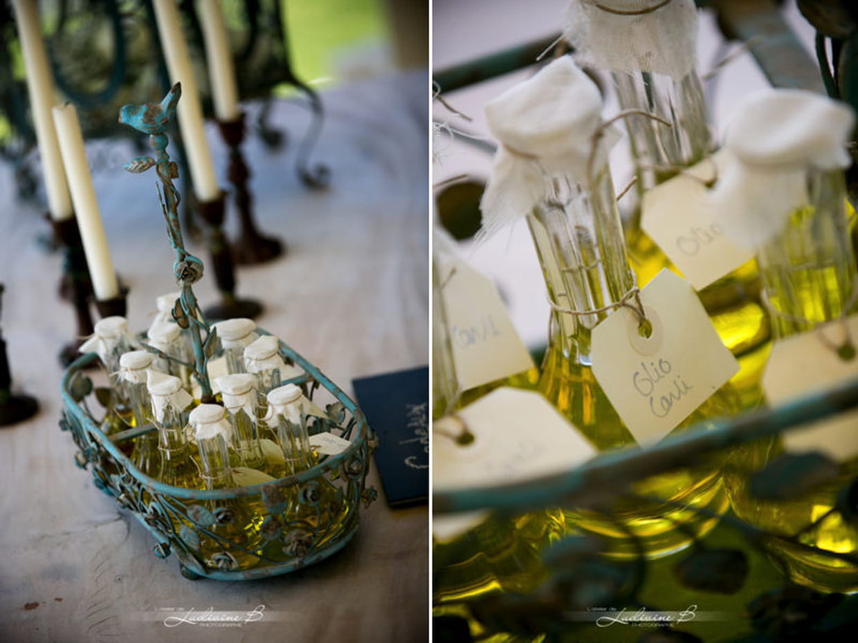 Pour remercier ses invités, on a coutume de leur offrir un petit présent. Et si les dragées font toujours plaisir, la tendance est désormais de personnaliser au maximum cette délicate attention. Pour ce shooting d'inspiration sur le thème de l'Italie, l'agence Weday's propose d'offrir des fioles contenant de l'huile d'olive.