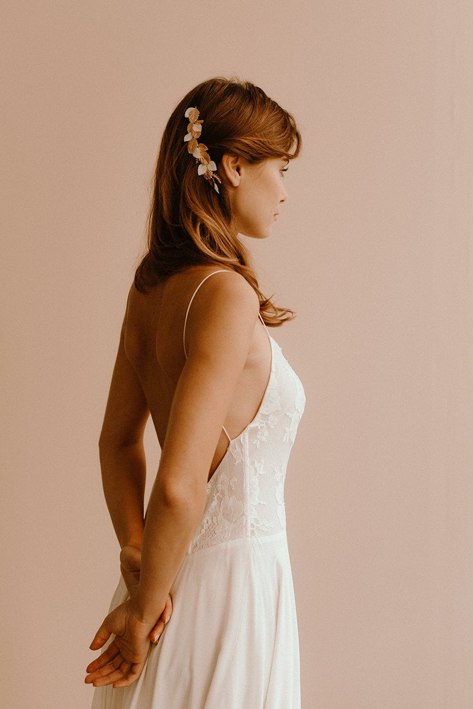 Le travail délicat de la soie et du laiton doré à l'or fin donne à ce peigne une allure raffinée. Une façon discrète de donner du corps à sa coiffure le jour J.