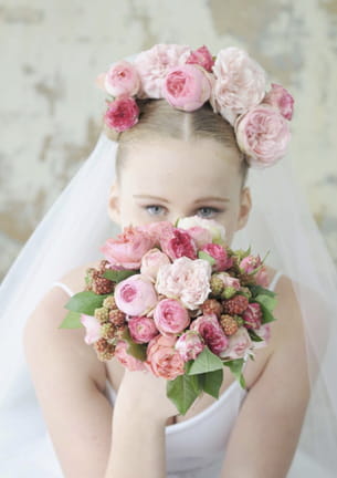 Pivoines et roses anciennes ornent cette couronne de fleurs fraîches, façon Frida Khalo, imaginée par le fleuriste Luc Gaignard. Parfaite pour les mariées romantiques dont les noces se déroulent au printemps... Pour les autres, sachez que l'artisan s'adapte aux fleurs de saison !