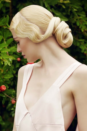 Pour un style sophistiqué, optez pour cette coiffure basse. Ici, les longueurs sont remontées et nouées de manière élégante. Le cran sur le front donne un effet Gatsby le Magnifique pour encadrer le visage des futures mariées façon rétro !