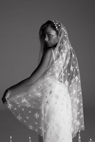 Le voile Circe est réalisé en tulle et est brodé de fleurs pour un effet romantique, voire féerique.