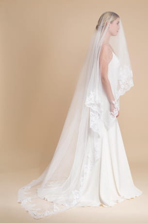La créatrice Delphine Manivet propose quelques accessoires pour habiller les mariées, comme ce voile long en tulle de soie, bordé de dentelle de Calais. Prix : 690 euros.