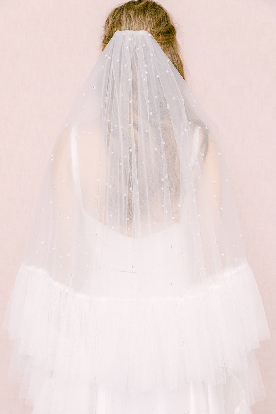Conçu et assemblé au sein de l'atelier parisien de la maison Les Couronnes de Victoire, ce voile de mariée est composé de tulle perlé de fabrication française et possède un bord froncé.