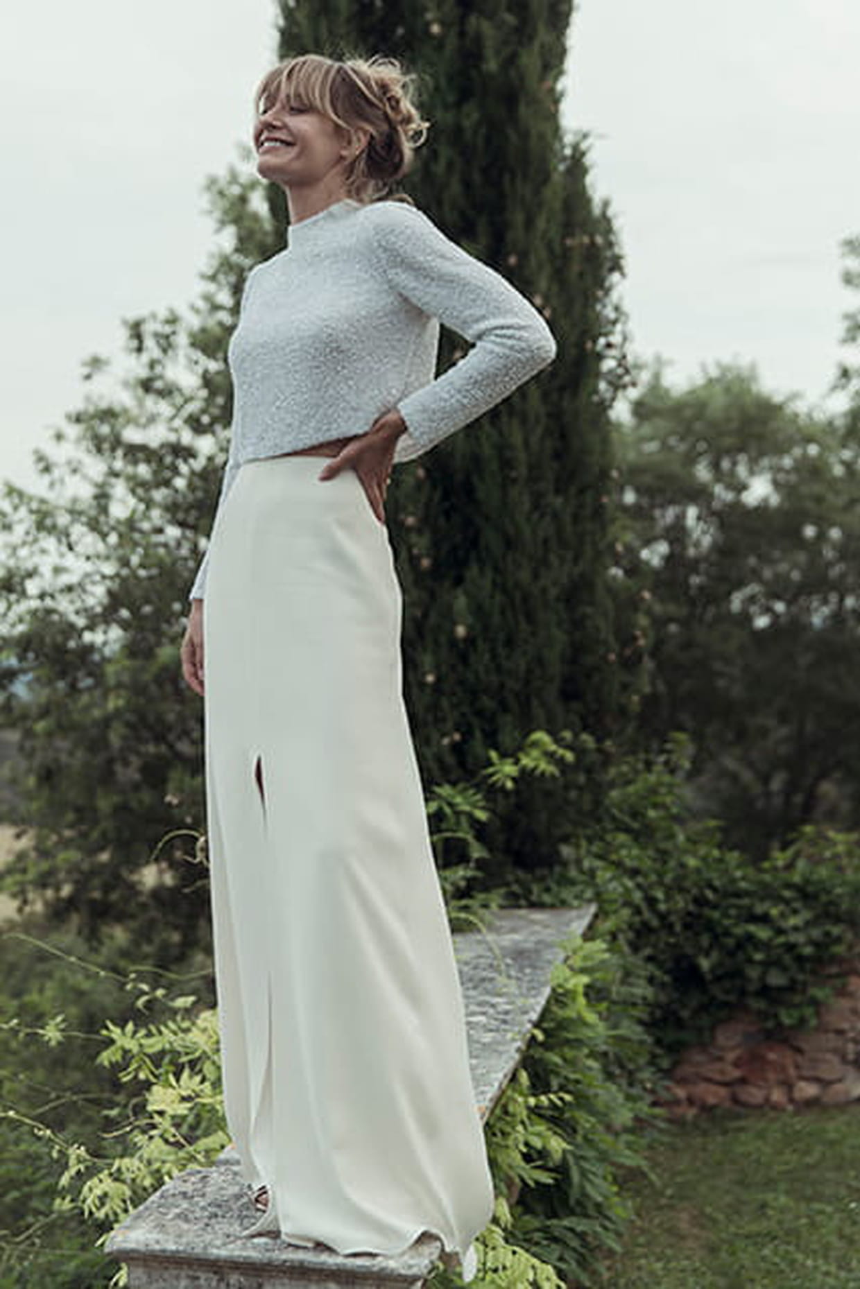 Parfait pour une union de demi-saison, ce top possède des manches longues et s'accorde joliment avec cette jupe fendue sur le devant.