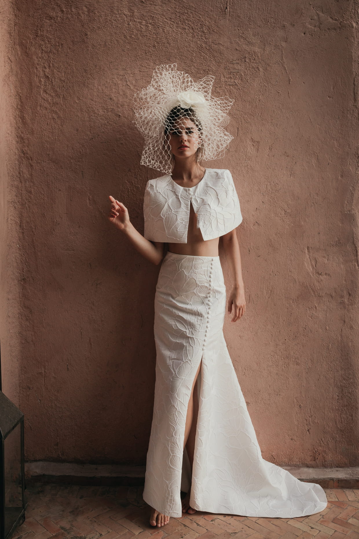 Cet ensemble Crop Top composé de jacquard, mise sur la modernité et l'originalité.