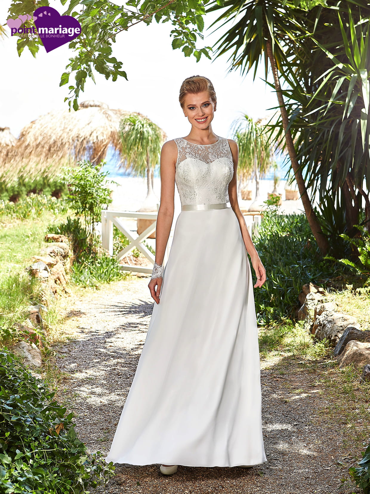 Une robe de mariée tout en légèreté, en mousseline fluide et soulignée à la taille par une ceinture en satin. Son bustier orné de dentelle avec un bel effet de transparence et son joli dos mêlent féminité et élégance.