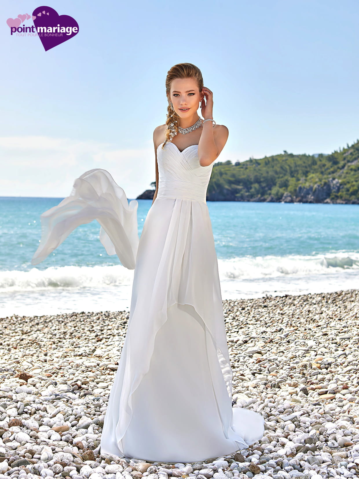 Une robe de mariée tout en légèreté, grâce à sa mousseline fluide et son esprit bohème. Sa taille haute est marquée par une ceinture et son bustier drapé est ultra-féminin.