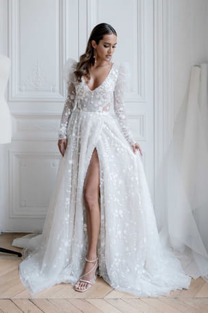 Romantique à souhait, cette robe est composée de dentelle fleurie délicatement posée à la main sur de l'organza.  Sa découpe à la taille, ses manches longues et sa fente lui donnent une allure couture.
