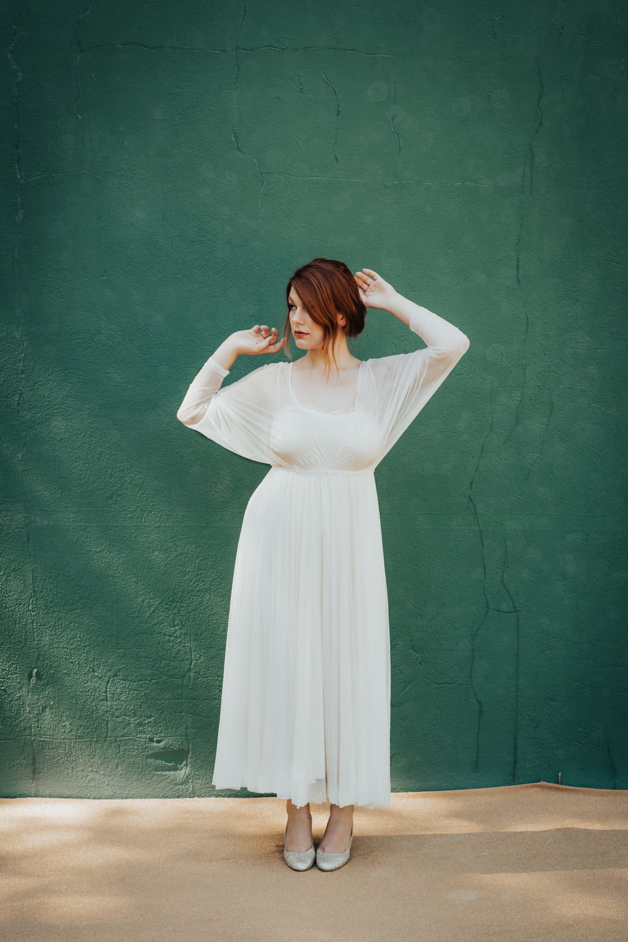 Le modèle Kitty allie une jupe trapèze en jersey et crêpe de soie lourd et un top à manches chauve-souris, décoré d'une dentelle de Chantilly.