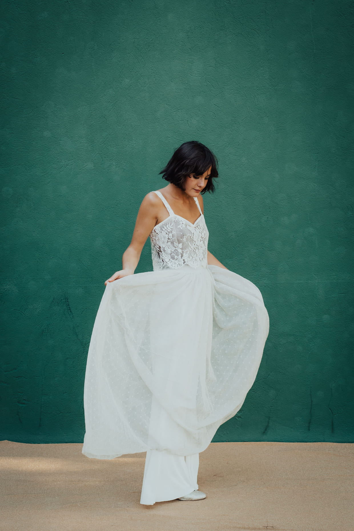 Plutôt que d'opter pour une robe de mariée, osez un ensemble top et jupe que vous pouvez mixer au gré de vos envies. Ici, la jupe ample et fluide en tulle plumetis se marie à merveille avec le bustier Vivien en dentelle de Calais à motif floraux.