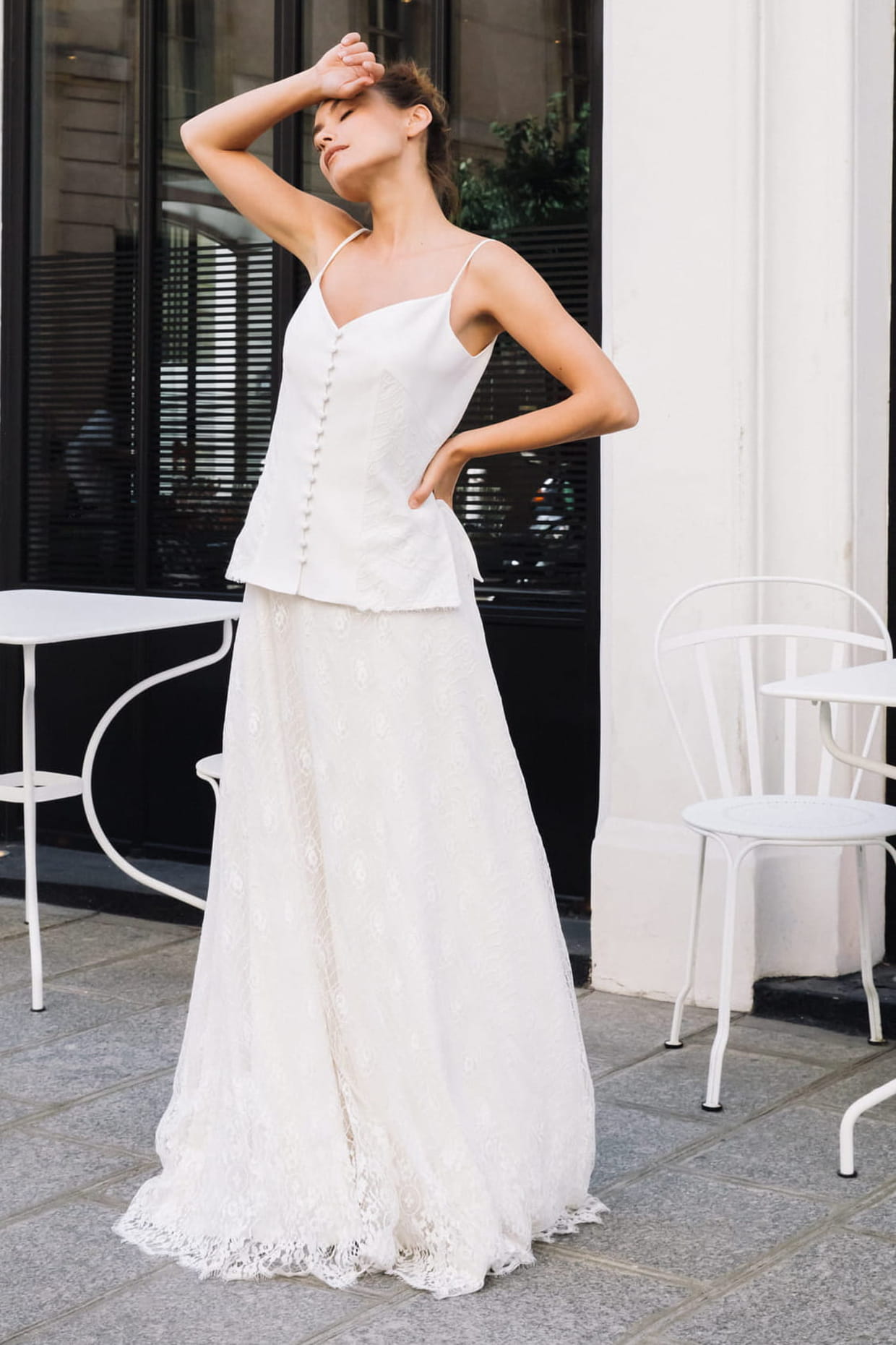 Le top Fiona magnifie les épaules et assume son côté bohème. Il est accompagné de la jupe Jo dotée d'un joli volume.