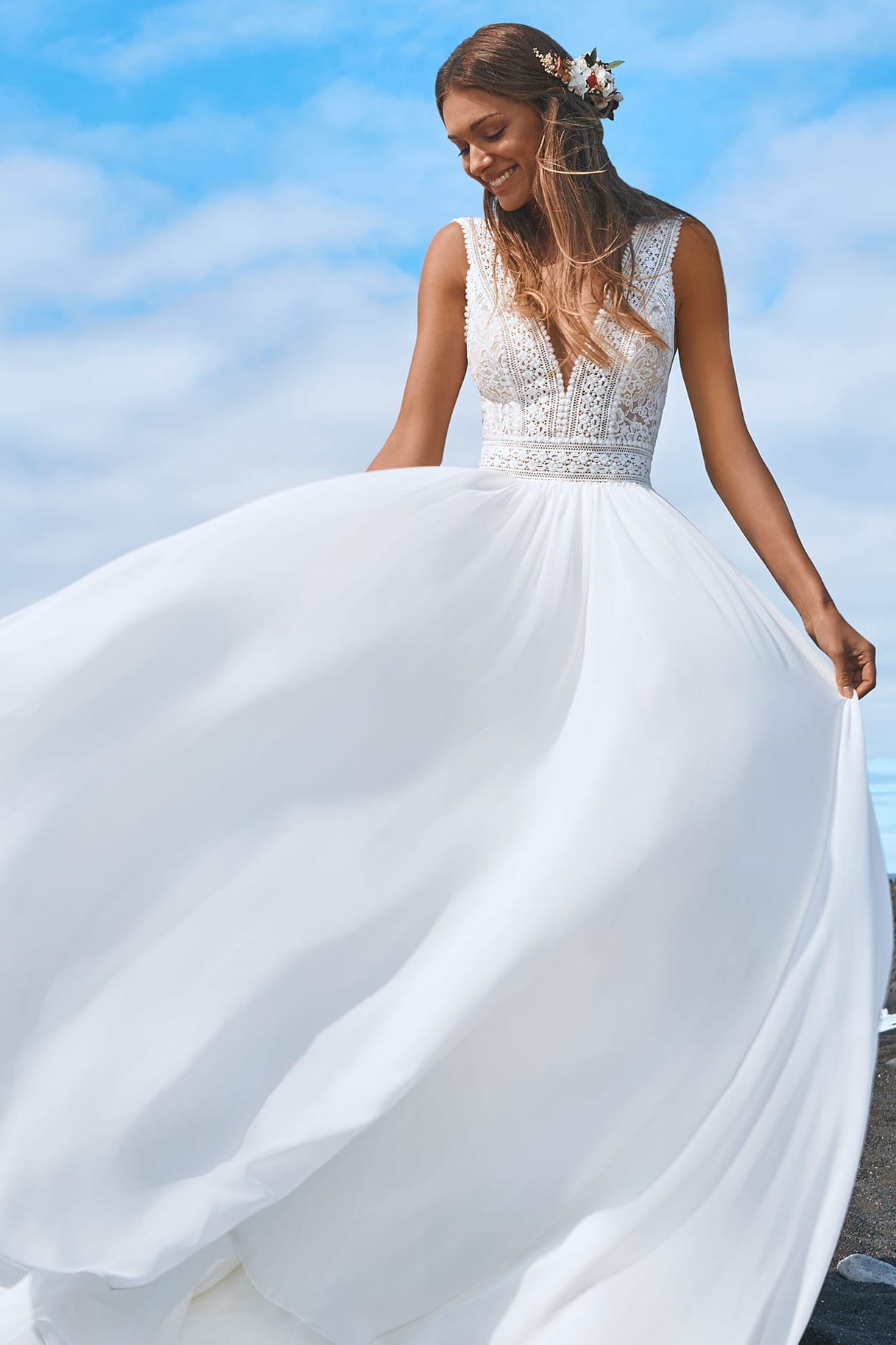 En mousseline de soie légère et en dentelle macramé texturée, cette robe assume son côté boho. Son corsage ajusté et son décolleté en V plongeant lui apportent beaucoup de sensualité.