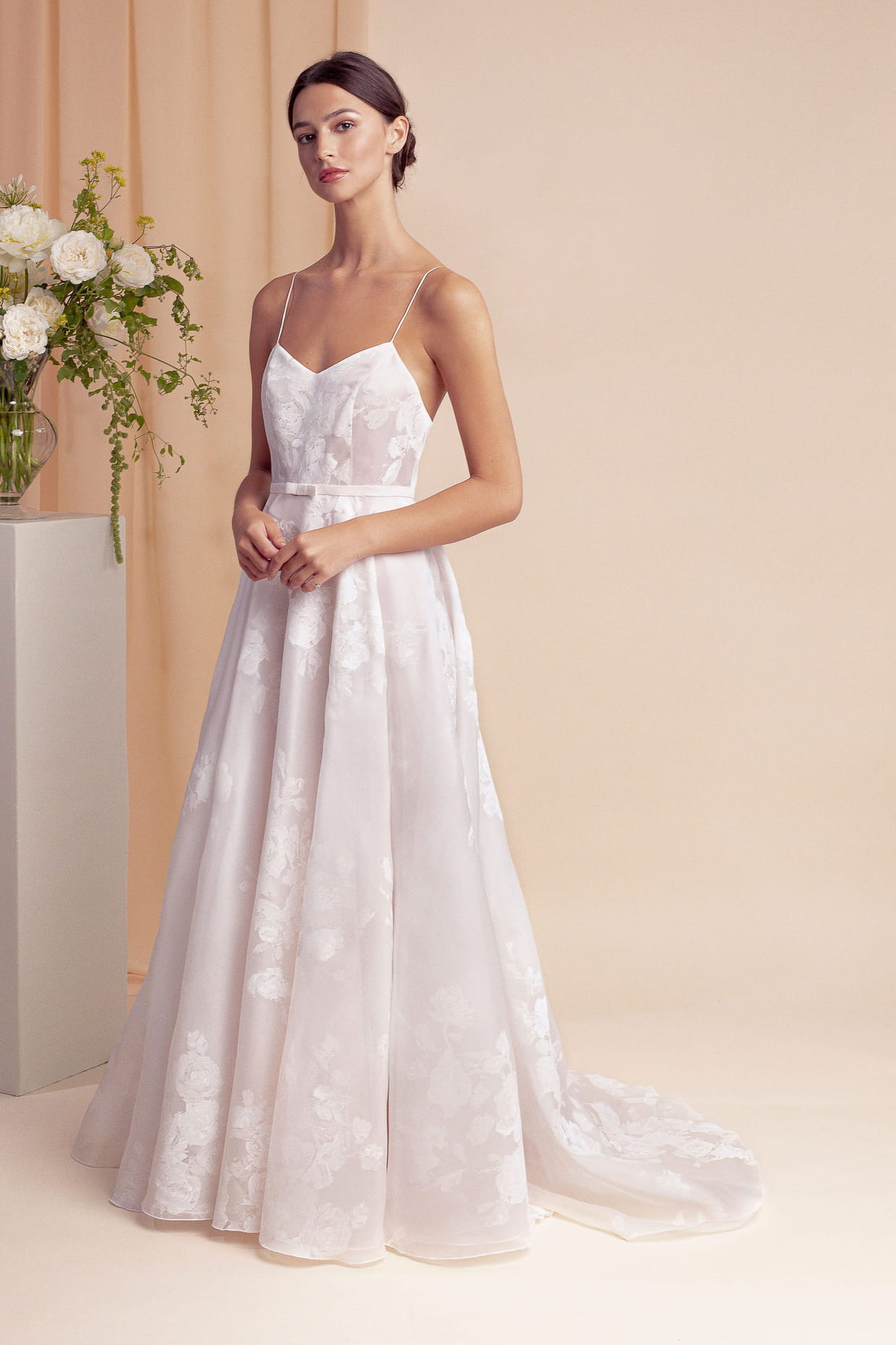 Cette robe princesse en organza de soie possède des bretelles spaghettis et une fine ceinture amovible. La robe Nina peut se porter avec son top amovible en organza de soie.