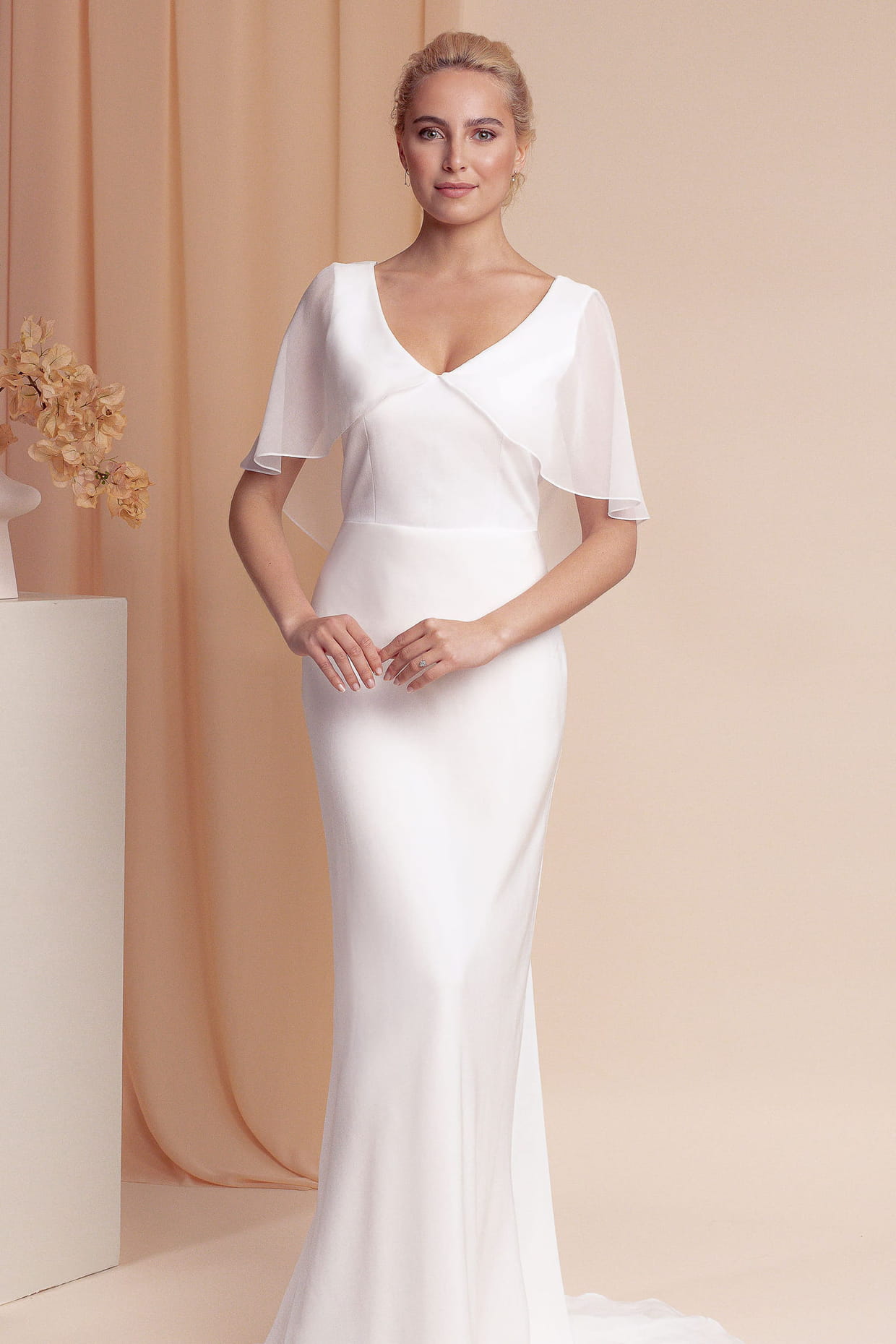 Cette robe ajustée en crêpe de soie est boutonnée dans le dos. La robe Iris possède une petite cape en Georgette de soie et un col bénitier.