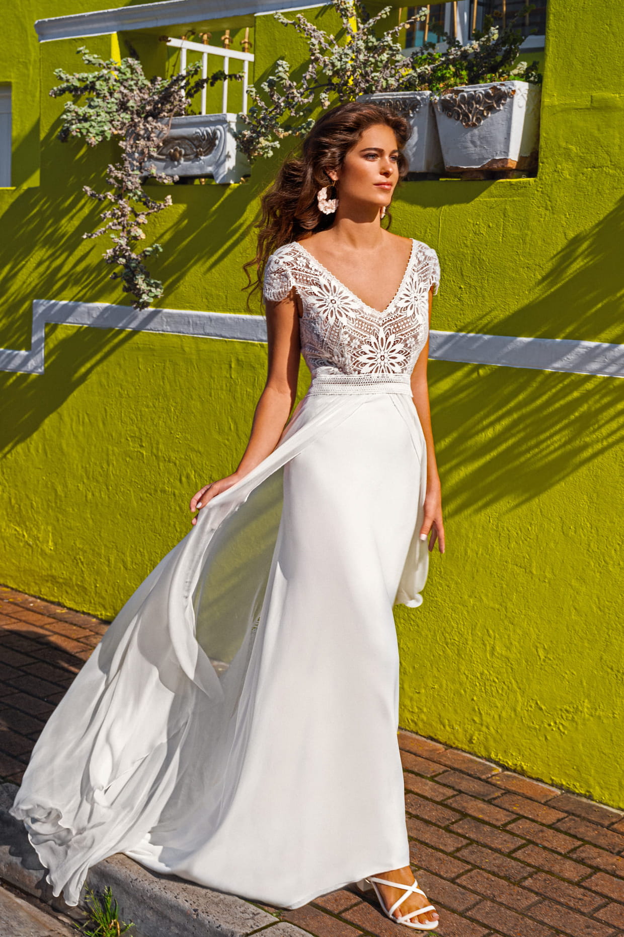 Sur ce modèle, l'accent est mis sur la dentelle très moderne qui orne le haut de robe mais également sur la traîne qui compose le bas. Cette ouverture sur le devant, qui est accentué par le voilage, permet de souligner la coupe de la robe sur le bas. Un empiècement en dentelle met en valeur la taille, tout comme le profond décolleté dans le dos.