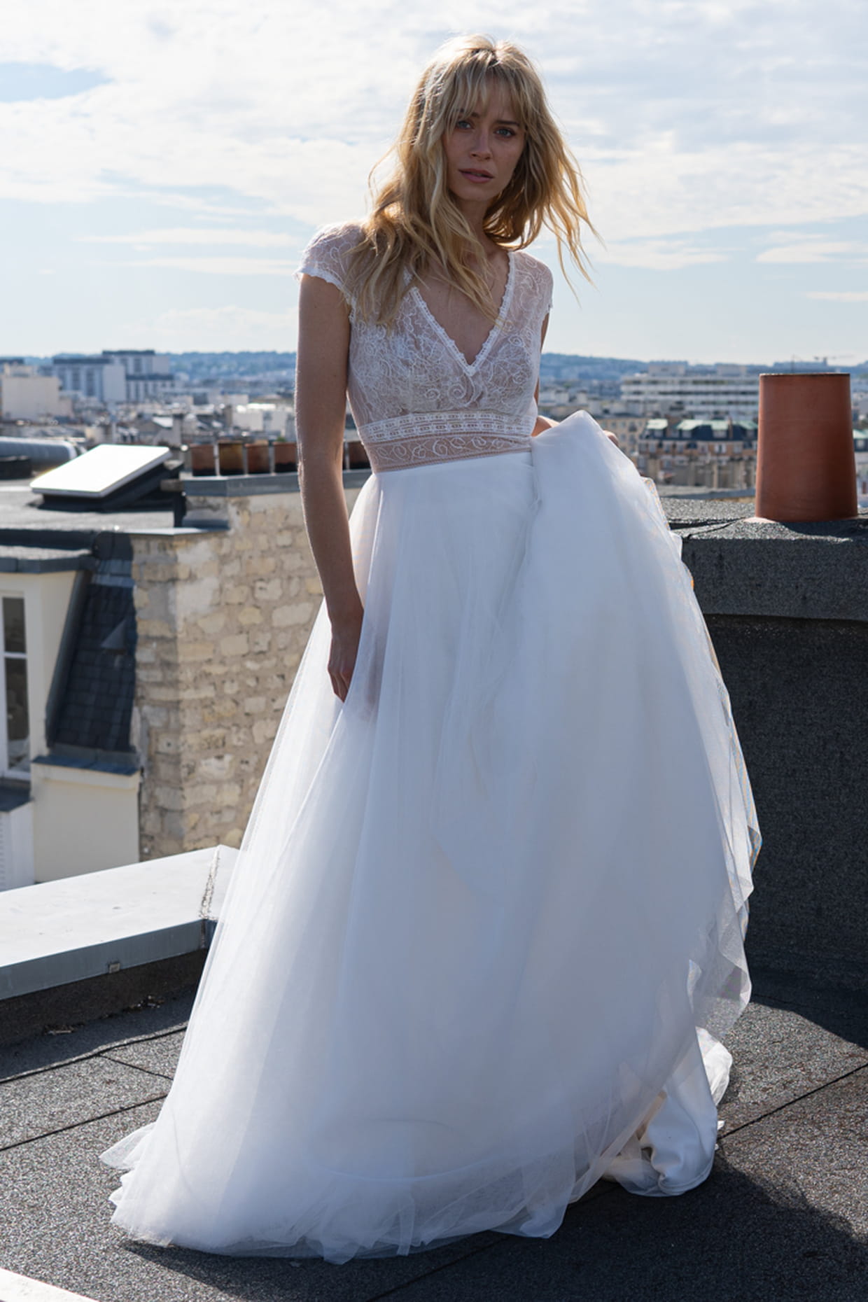 La robe Nadira est en dentelle de Calais fine, avec un décolleté en V et un V renversé dans le dos. Sa jupe est en tulle plume. Elle existe également avec un dos en V (robe Nuance), un dos en V en mousseline (robe Nanouk) ou entièrement composée de mousseline (robe Nolene).