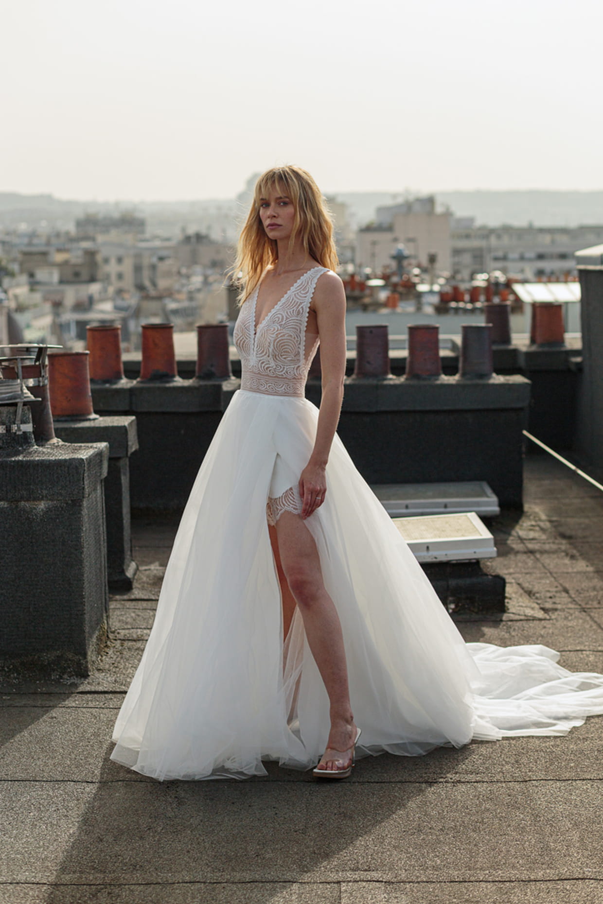 La robe Naïs est faite de dentelle de Calais, avec un décolleté en V à la fois devant et dans le dos. La jupe quant à elle, se compose de nuées de cercles de tulle et présente une jolie fente sur le côté.
