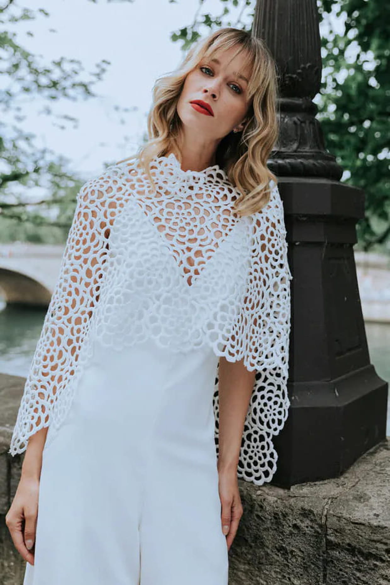Cette combinaison de mariée en crêpe arbore un décolleté en V et un dos ouvert en forme triangulaire. Son pantalon ample doté de poches passepoilées garantit aux mariées une grande liberté de mouvement. En version courte, cette combinaison s'appelle Rafaelle. Toutes deux peuvent être portée avec le Top en guipure Reggae.