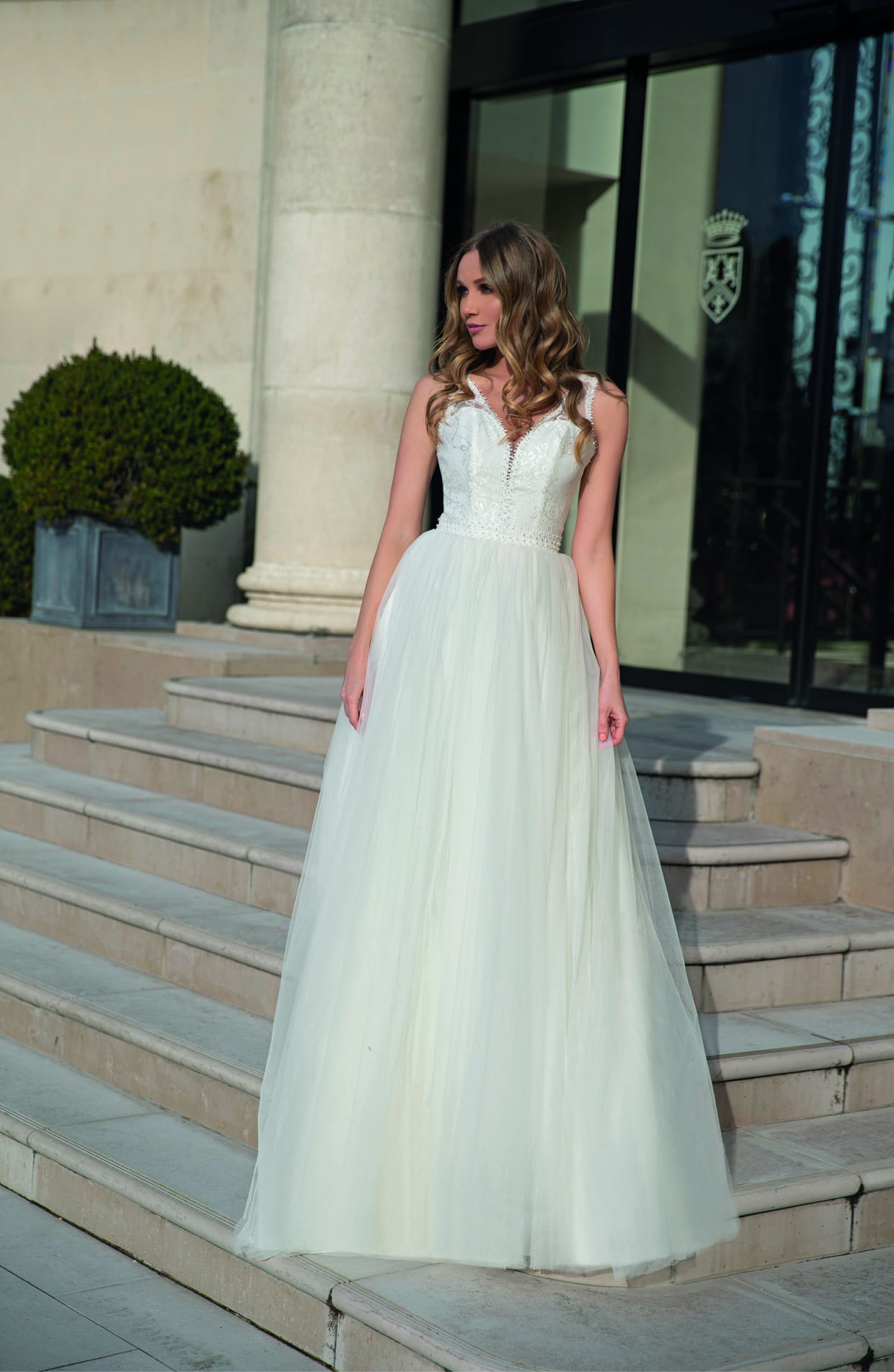 Avec son corsage en tulle et dentelle perlée, la robe Donatella affiche un décolleté plongeant et de larges bretelle en dentelle.