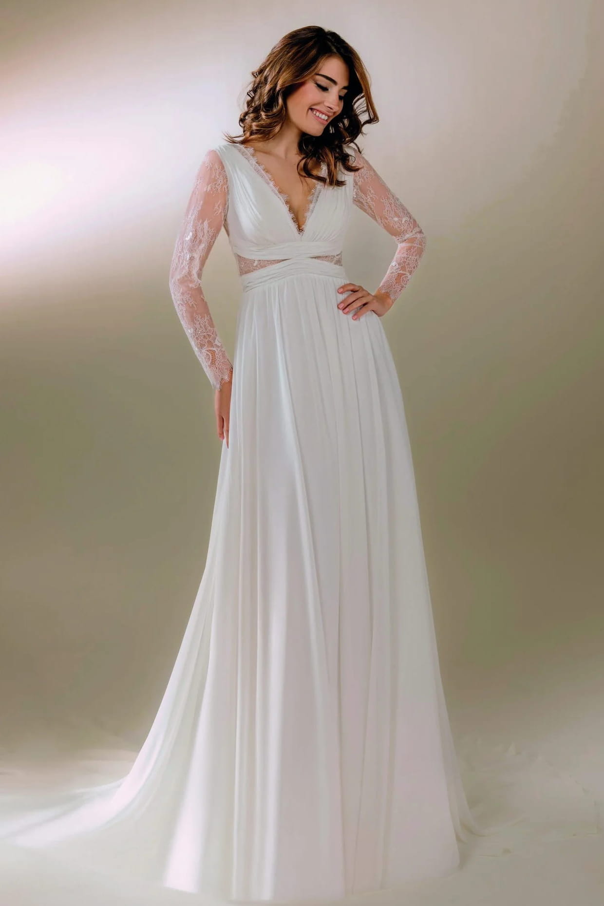 Romantique grâce à la dentelle de ses manches longues transparentes, cette robe de mariée possède un décolleté en V et une courte traîne.
