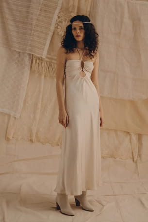 Cette robe de mariée fait partie de la collection Sessùn Oui. Très fluide, elle possède des fines bretelles croisées en toile de viscose, issu de bois de forêts certifiées gérées durablement, qui lui donne des allures de vestale grecque.