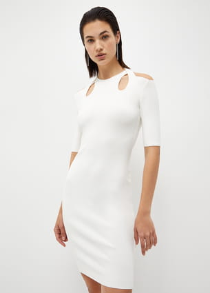 Près du corps, cette robe courte Liujo met en valeur les courbes des mariées. Dotées de manches 3/4, elle révèle leurs épaules grâce à des découpes audacieuses et harmonieuses.