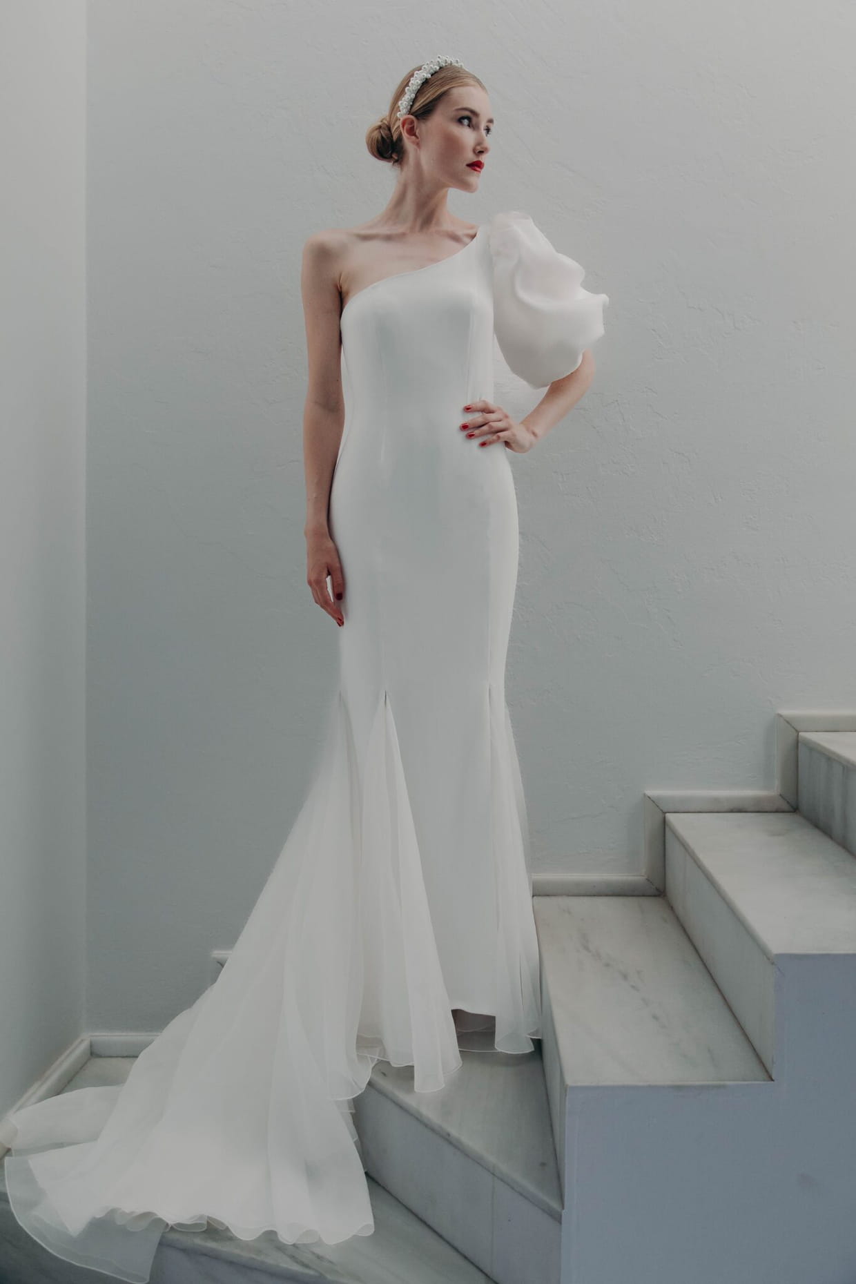 Ce modèle one shoulder possède un jolie manche bouffante. Epousant parfaitement les courbes des mariées, cette robeest composée d'une jupe structurée qui se termine par une traîne.
