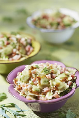 Salade de ravioles aux herbes, jambon cru et vinaigrette à l'orange