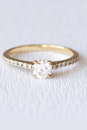 Ce solitaire épaulé appelé Hortense est orné d'un diamant rond qui se reflète dans les gemmes qui recouvrent ses contours.