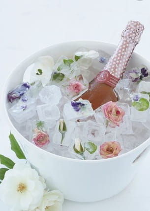 Pour être dans l'esprit "garden party" jusque dans les moindres détails, réalisez des glaçons avec des fleurs comestibles. Dans un seau à champagne ou dans des cocktails, cette idée déco fera son petit effet !