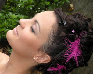C'est finalement une coiffeuse expérimentée qui a réalisé la fameuse coiffe : boucles entrelaçées, frange avec perles fushias et plumes.
