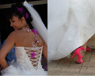 Les chaussures ont fait l'objet d'une longue recherche. "J'ai fini par trouver les chaussures de la marque Diesel. Mi-escarpins, mi-sandales, elles sont roses fluos et très confortables, même avec 9 centimètres de talons !". Quel pied...