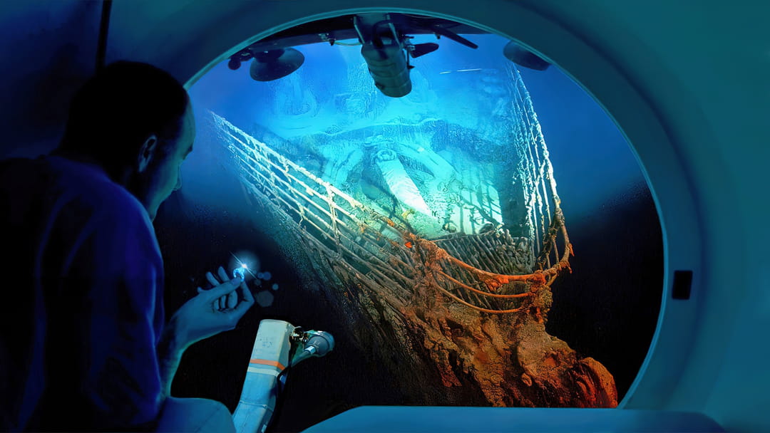 C'est alors qu'ils apercevront l'épave du Titanic, qui sombre depuis plus d'un siècle dans les abîmes de l'océan. Les moindres recoins du paquebot transatlantique seront scrutés durant cette expérience inédite pendant près de deux heures : pont-promenade, cabines des officiers, salle radio, passerelle du capitaine, hall du Grand Escalier, etc.