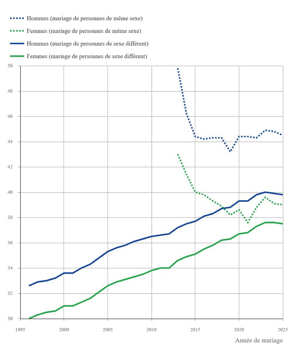 En 1975, on se mariait en moyenne autour de 25 ans. Mais un demi-siècle plus tard, c'est une toute autre histoire. Selon les données de l'Insee, "en 2025, l'âge moyen des femmes au mariage est de 37,5 ans lorsqu'il s'agit de mariages entre personnes de sexe différent, et de 39,0 ans lorsqu'il s'agit de mariages entre personnes de même sexe". Les hommes, eux, sautent le pas encore plus tard : 39,8 ans en moyenne pour les mariages entre couples hétérosexuels, contre 44,5 ans pour les mariages entre couples homosexuels. Face au coût financier d'un mariage et à l'éventualité indéniable d'un divorce, lui aussi coûteux mais surtout émotionnellement lourd, on réfléchit plus longtemps avant de se jurer fidélité pour la vie. Mais un mariage plus tardif est-il vraiment gage d'une relation durable ?