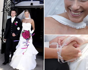 "Comme toutes les futures mariées, j'ai essayé de nombreuses robes avant de faire mon choix. On m'avait même proposé de réaliser du sur-mesure pour le même prix... Mais j'avais déjà essayé la robe de mes rêves : la Sabeau ivoire de Rembo Styling. Je l'avais vue sur une autre mariée alors que je passais dans un magasin. Son originalité m'a séduite : son asymétrie ainsi que ses bretelles inversées sont d'une grande élégance. De plus, ses petits brillants et cristaux m'ont rappelé les décorations que j'étais en train de préparer. Pour mes boucles d'oreilles et mon bracelet, j'ai choisi des perles Swarovski identiques à celles de la robe."