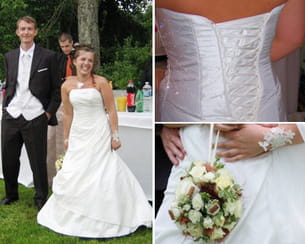 Pour le choix de sa robe, Emilie a suivi les conseils d'une professionnelle, qui lui a proposé un modèle ajusté sur le haut du corps puis évasé à partir du haut des jambes. "Ce qui me plaisait à moi ne m'allait pas forcément, ce qu'elle avait sélectionné était parfait. Finalement j'ai retenu l'une des premières robes que j'ai essayé ! Une robe bustier blanc cassé, plutôt sobre, brodée de perles et fermée par un beau corsage dans le dos. Mon bouquet rond, que je retenais à la main par un petit ruban, était composé de roses blanches et de cannelle".
