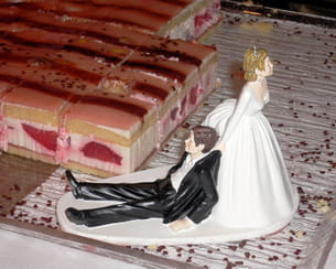 "Après le vin d'honneur accompagné de ses verrines, nous avons entamé l'entrée à base de poisson, puis une viande avec ses petits légumes, sans oublier les fromages et bien entendu le dessert. Nous ne voulions pas de pièce montée, mais plutôt de véritables gâteaux, l'un à la fraise, l'autre au chocolat. Nous avons adoré les personnages du gâteau, peu classiques... Le repas était simple, très bon, mais heureusement que nous avions fait un test auparavant, car le jour J je n'ai pas trop eu le temps de le déguster !"
