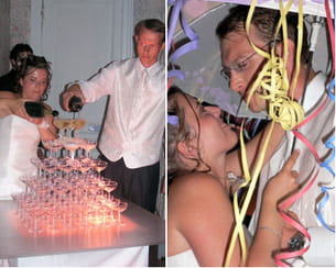 "Lors de la soirée, nous avons organisé des jeux mon mari et moi. Le premier jeu consistait à deviner, pour les femmes, le poids de la tenue du marié et inversement pour les hommes. Il y avait à gagner un dîner aux chandelles (qui s'avérait être en réalité une boîte de raviolis accompagnée de deux bougies), un superbe voyage à Paris (soit deux tickets de métro) et le premier lot était la jarretière. Puis nous avons entamé le bal par la fameuse danse du parapluie, où les invités peuvent s'en donner à coeur joie en lancés de serpentins." Un mariage tout en délices, rires et passion.