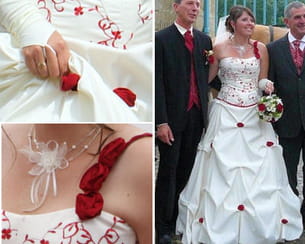 "Pour ma robe, j'avais une condition sine qua non : elle devait être bordeaux et ivoire. J'ai eu un coup de foudre pour le modèle "Matea" de Point Mariage, qui est à la fois moderne et délicat. Le petit détail de la bretelle, décorée de trois boutons de roses rouges, m'a fait fondre. Pour mon mari, nous avons choisi un ensemble sobre noir, avec un gilet et une cravate bordeaux, afin qu'il soit coordonné avec ma tenue."