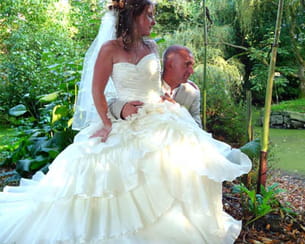 "Pour la robe ce fut tout une histoire ! Je n'ai eu à faire qu'un magasin : cette robe est un vrai coup de coeur, je l'avais repérée au Salon du Mariage et je la voulais. Direction la noutique avec ma mère, essayage, parfait, je la prends ! Nous fixons un rendez-vous avec la responsable pour recupérer la tenue après quelques retouches. Le jour prévu, des dizaines de femmes attendaient devant la boutique qui était en liquidation judiciaire !  Pour finir, nous avons réussi à prendre un autre rendez-vous et j'ai eu ma robe (que j'avais déjà réglée intégralement !)."
